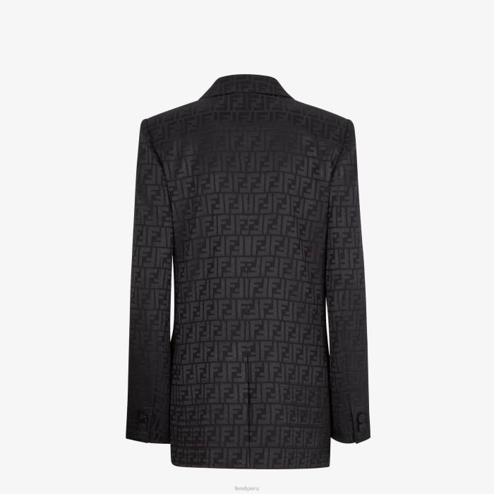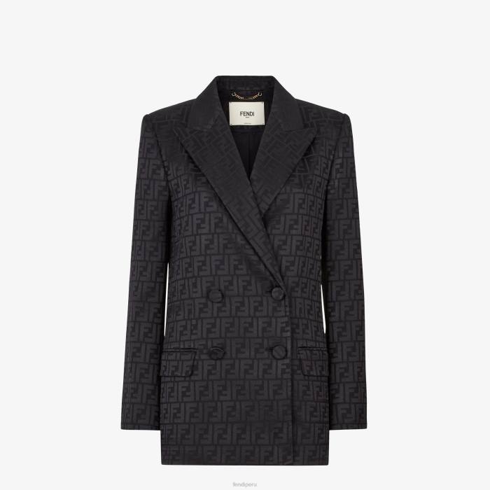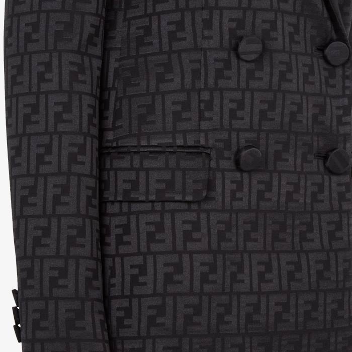 Chaqueta cruzada de corte recto con solapas de pico. Bolsillos con solapa y abertura central trasera. Confección en crepé de seda negro con motivo ff en jacquard por toda la prenda. botones forrados a juego.