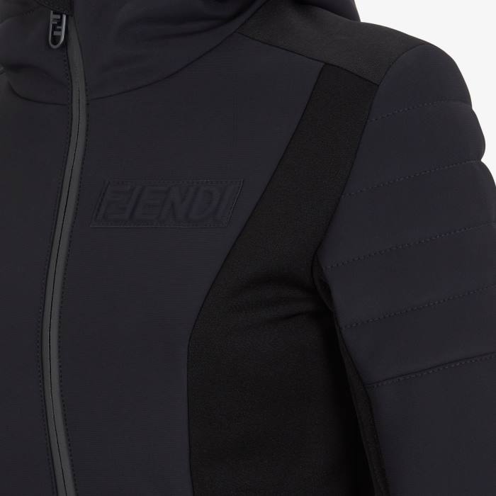 chaqueta de esquí ajustada con capucha. Tirantes ajustables en cintura y puños. bolsillos laterales con cremallera y un bolsillo para el forfait en la manga izquierda. cierre de cremallera. Confeccionado en tejido técnico negro con parche de Fendi en relieve aplicado en el pecho. adornado con inserciones de malla en los laterales y debajo de las mangas y detalles acolchados en los hombros.