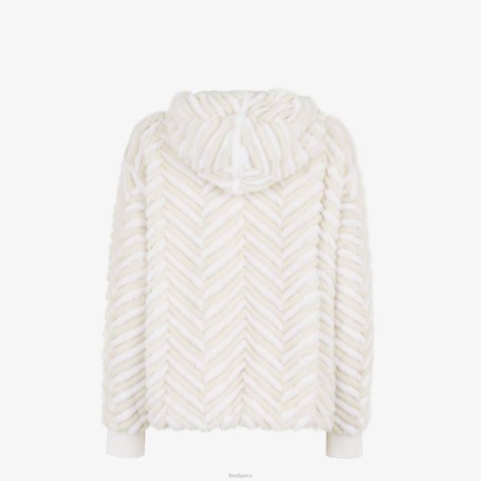 Chaqueta con capucha con cordón y borde. Bolsillos laterales y puños de punto. cierre de cremallera frontal. Confección en visón con motivo de chevrones en color blanco. forrado en seda. la construcción especial tipo pluma con motivo de chevrón hace que el artículo sea excepcionalmente liviano.