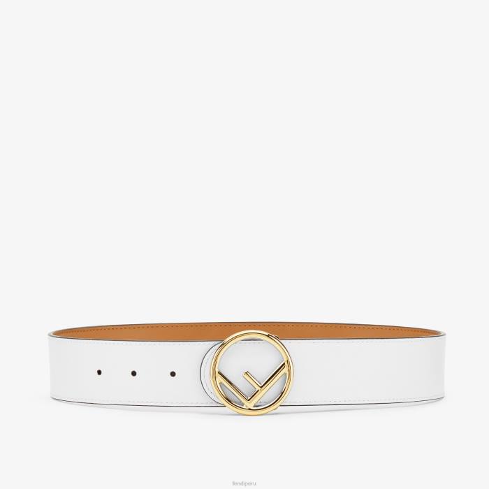 cinturón reversible. Hebilla redonda con la nueva forma del logotipo de Fendi y cierre de tachuelas. Realizado en piel blanca y color caramelo. artículos de metal con acabado dorado.