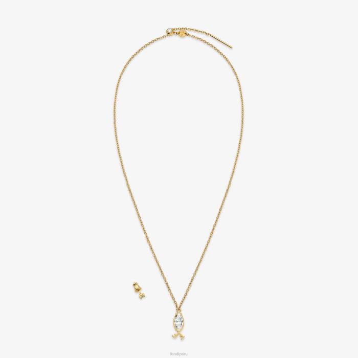 Conjunto formado por un collar de cadena fina con un colgante del signo zodiacal piscis que también puede usarse como pendiente. fabricado en metal con acabado dorado. adornado con cristales blancos.