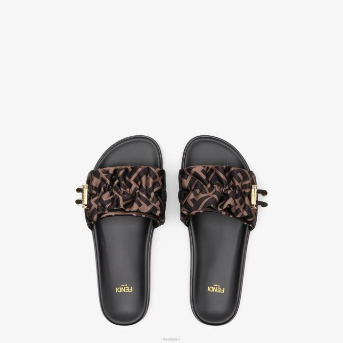diapositivas planas de banda ancha. Confección en raso con motivo ff marrón y tabaco. acabado con tapón con logo y cordón con acabado dorado.