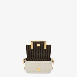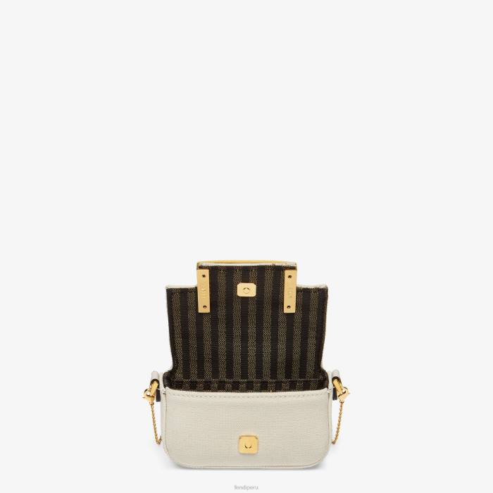 Versión nano del icónico bolso baguette, con solapa y cierre ff con cierre magnético. el clip permite sujetarlo como un amuleto a bolsos o cinturones más grandes. También se puede llevar cruzado gracias a la fina bandolera ajustable con cadena. Tarjetero con bolsillo plano en el interior. Confección en lona beige con bordado ff multicolor. Detalles en piel napa blanca. artículos de metal con acabado dorado.