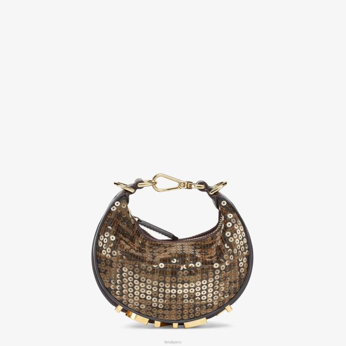 Bolso hobo nano fendigraphy con cierre de cremallera, adornado con letras fendi vintage de metal dorado. la correa ajustable con clip permite sujetarlo a bolsos más grandes o llevarlo en la muñeca. Viene con ganchos para la correa para el hombro. Confeccionado en tejido jacquard ff con bordado de lentejuelas. Detalles en piel marrón oscuro. Accesorios de metal con acabado dorado vintage.