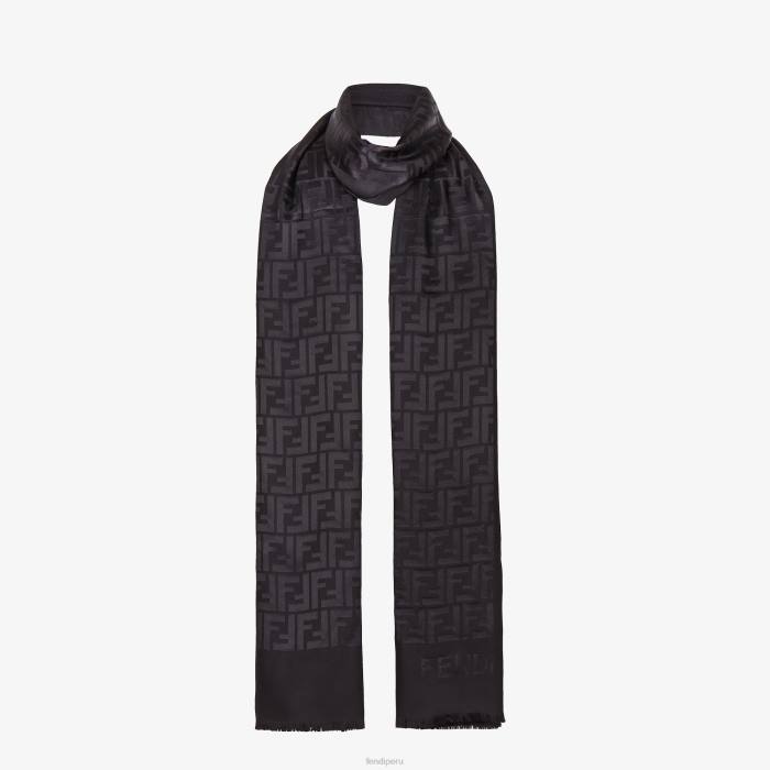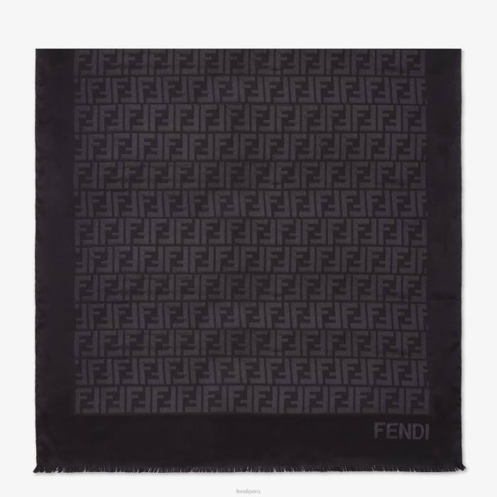 Gran estola rectangular confeccionada en seda orgánica negra. Motivo ff tono sobre tono por toda la prenda. bordes con flecos a mano.