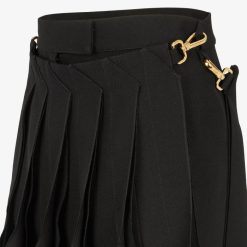 falda corta de cintura alta. los paneles a juego con pliegues para llevar en la cintura crean volumen y efecto asimétrico con la falda. confeccionado en lana grain de poudre negra. artículos de metal con acabado dorado.