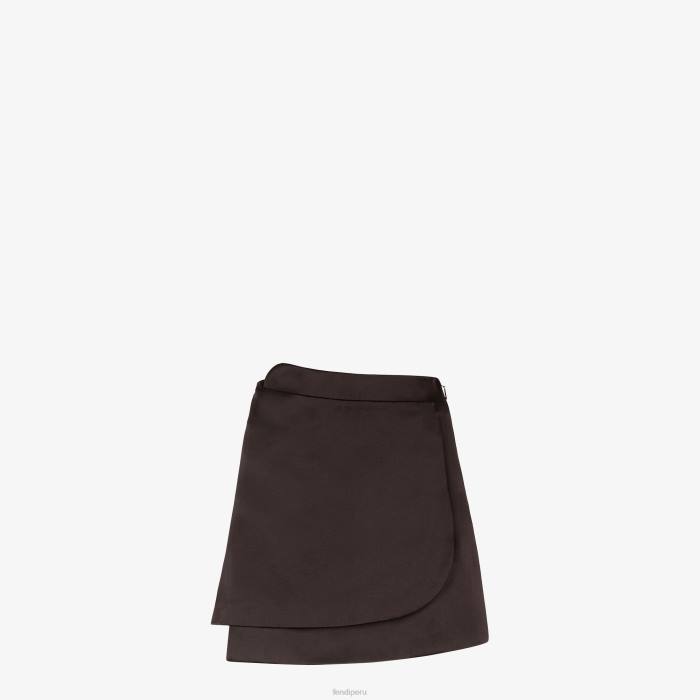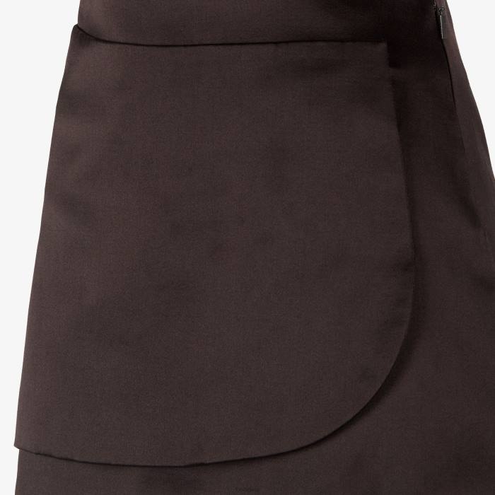 falda cruzada corta de cintura alta. cierre de cremallera lateral. Confeccionado en raso duquesa de seda y algodón marrón con textura lavada. forrado.