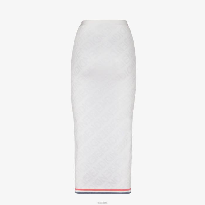 falda lápiz midi. confeccionado en punto de viscosa blanco, con intarsia con letras de espejo fendi del mismo color por toda la prenda. adornado con una doble raya deportiva en el fondo en rosa y azul claro.