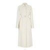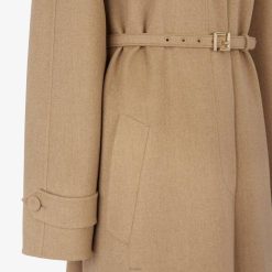 abrigo largo de botonadura sencilla. Cuello camisero y manga larga raglán con tirantes en puños. Bolsillos ribeteados en los laterales. cierre oculto. Confección en cachemir beige de doble cara. cinturón a juego con hebilla ff de metal.