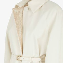 Abrigo largo, de corte recto y de botonadura sencilla. Cuello camisero y manga larga raglán. Bolsillos de ribete en los laterales y abertura central trasera. cierre oculto. confeccionado en tela de color blanco crema. el interior está completamente bordado con microlentejuelas en un color pálido en contraste. cinturón a juego con hebilla ff de metal.
