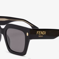 Gafas de sol fendi roma cuadradas y extragrandes confeccionadas en acetato negro. patillas con núcleo metálico visible con ff grabado con láser. Logotipo de Fendi Roma con acabado dorado en los laterales. lentes grises.