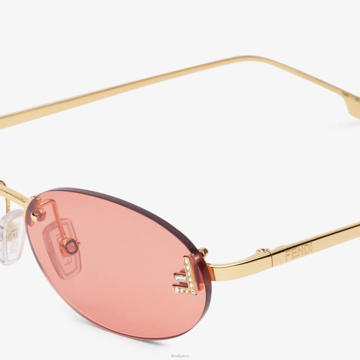 Presentadas en el desfile otoño-invierno 22, estas gafas de sol de metal dorado con forma ovalada se inspiran en la atmósfera de los años 2000. En consonancia con la nueva primera línea de joyería de moda de Fendi, diseñada por Delfina Delettrez Fendi, están decoradas con un diseño de micro f de cristal. lentes rojos. almohadillas nasales ajustables.