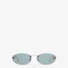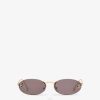 Presentadas en el desfile otoño-invierno 22, estas gafas de sol de metal dorado con forma ovalada se inspiran en la atmósfera de los años 2000. En consonancia con la nueva primera línea de joyería de moda de Fendi, diseñada por Delfina Delettrez Fendi, están decoradas con un diseño de micro f de cristal. lentes azules. almohadillas nasales ajustables.