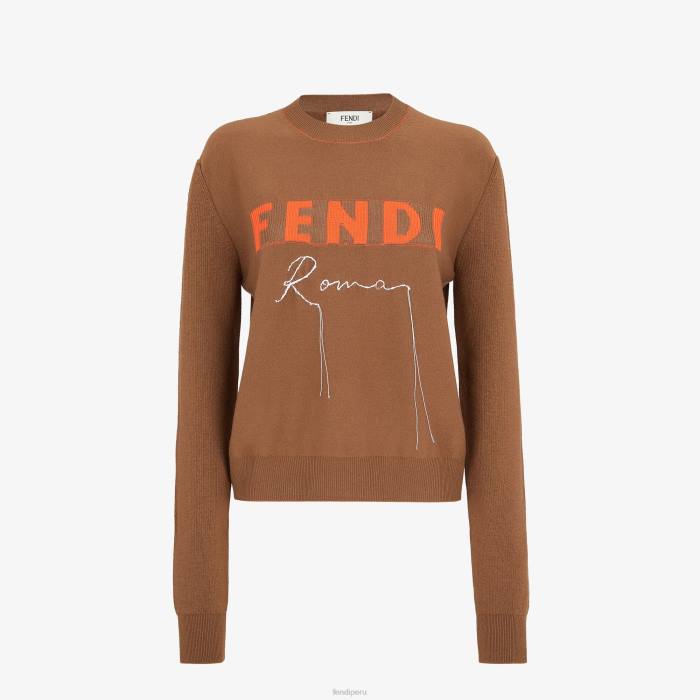 suéter suave con cuello redondo. confeccionado en hilo de cachemira marrón. personalizado con letras fendi roma en intarsia roja y blanca, con detalle bordado en un estilo cosido a mano.