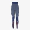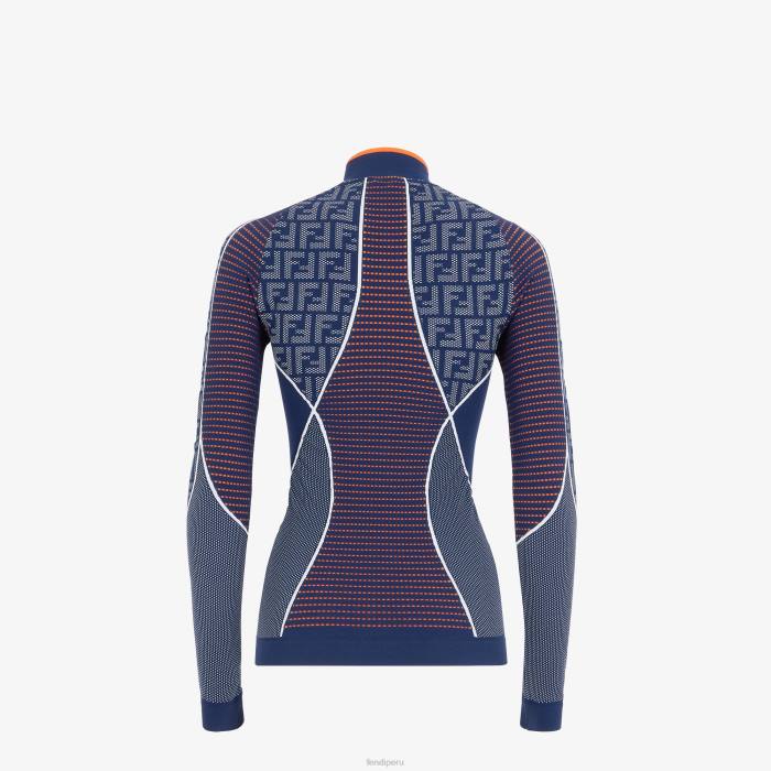Jersey ceñido sin costuras con cuello alto y mangas largas. Confección en punto técnico azul con detalles ff tono sobre tono. adornado con inserciones de micromalla naranja y azul.