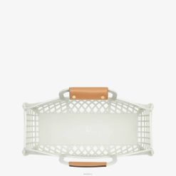 Bolso de mano de tamaño mediano fabricado íntegramente en plástico reciclado de color blanco, decorado con un sello fendi de piel repujado en color marrón claro.