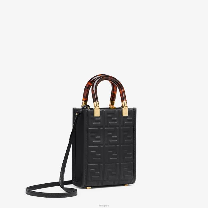 Bolso shopper mini sunshine confeccionado en piel negra con motivo ff textura 3d y asas rígidas de plexiglás efecto carey.
