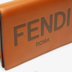 minibolso con diseño geométrico, confeccionado en piel de color marrón estampado con el logo fendi roma.