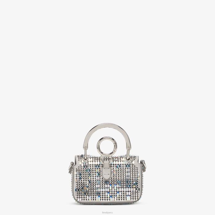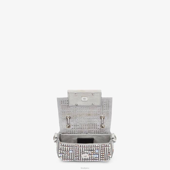 Versión nano del icónico bolso baguette, con solapa, asa y cierre ff con cierre magnético. el clip permite sujetarlo como un amuleto a bolsos o cinturones más grandes. También se puede llevar cruzado gracias a la fina correa ajustable para el hombro. Tarjetero con bolsillo plano en el interior. Este modelo, que forma parte de la edición limitada de Fendi by Marc Jacobs, está confeccionado en nobuk gris y bordado por todas partes con cristales blancos de diferentes tamaños. Artículos metálicos con acabado en paladio.
