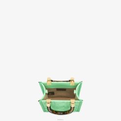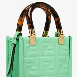 Bolso shopper mini sunshine confeccionado en piel verde con motivo ff textura 3d y asas rígidas de plexiglás efecto carey.