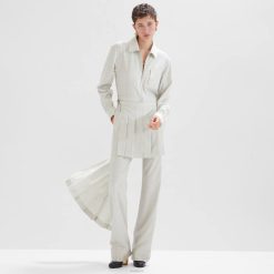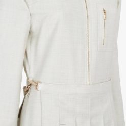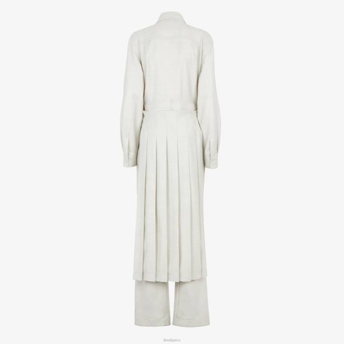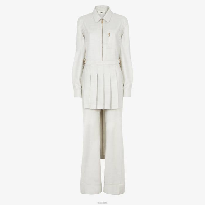 Mono estilo camisero con cuello camisero y manga larga terminada en puño. bolsillo con cremallera en el pecho y trabillas en la cintura. Cierre de cremallera frontal visible. confeccionado en franela de lana de color blanco crema. Los paneles a juego con pliegues para llevar en la cintura crean un efecto asimétrico con el pantalón. artículos de metal con acabado dorado.