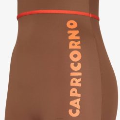 Body de ciclismo ajustado sin mangas. Confeccionado en lycra marrón con letras fendi astrology estampadas en contraste en los laterales. adornado con doble ribete en los bordes y cintura en naranja y blanco. bolso a juego con cordón y logo de fendi roma.