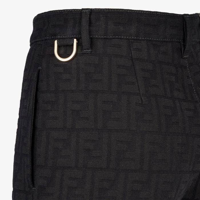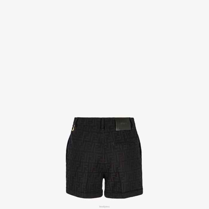 Pantalón corto ajustado con vuelta en el bajo. Bolsillos insertados en los laterales y bolsillo de ribete en la parte trasera. cierre de cremallera oculta. Confección en denim azul oscuro con motivo ff en jacquard por toda la prenda. rematado con un anillo de metal en el lateral de la cintura y una etiqueta de piel con el logo de Fendi en la parte trasera.