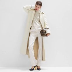 Pantalón largo entallado con cierre de corte diagonal adornado con hebilla. Cremallera oculta y cierre de gancho. hecho de lana de grano de poudre color crema.