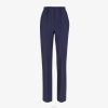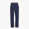 Pantalón entallado de talle alto con raya cosida en la pierna. bolsillos laterales y bolsillos de parche en la espalda. cierre de cremallera oculta. confeccionado con denim de algodón azul. adornado con pespuntes en color tabaco en contraste y anillo de metal dorado en la parte posterior de la cintura.