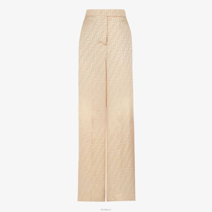 Pantalón palazzo entallado y de talle alto. Raya planchada, bolsillos laterales insertados y bolsillos traseros ribeteados. Cremallera oculta y cierre de gancho pequeño. Confección en crepé de seda beige con motivo ff en jacquard por toda la prenda.