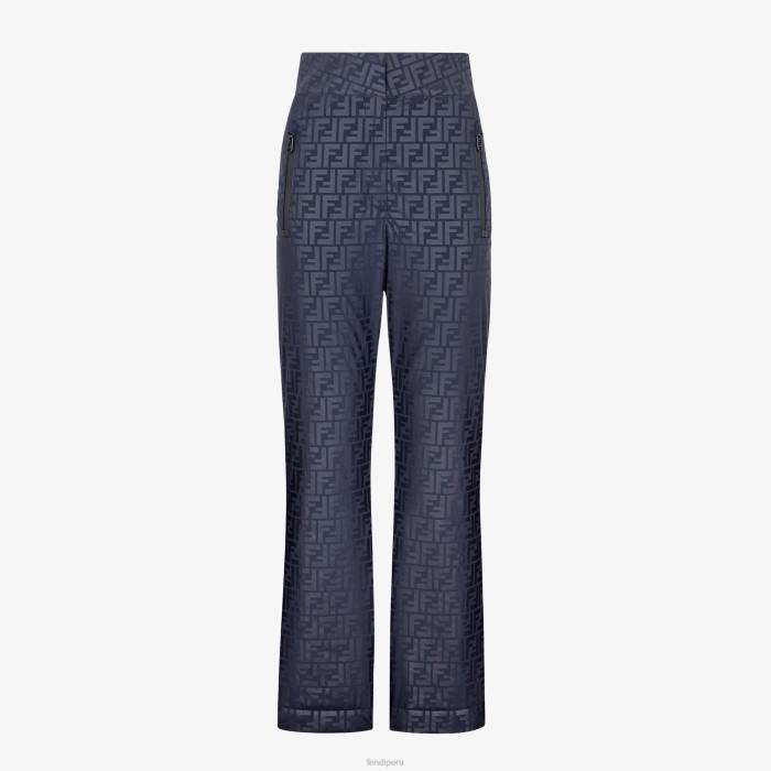 Pantalón de esquí de cintura alta con bolsillos con cremallera. Cierre de cremallera y botón ocultos. Confección en tejido técnico azul con motivo ff estampado por toda la prenda a juego. adornado con una maxietiqueta fendi negra aplicada en la parte posterior de la cintura.