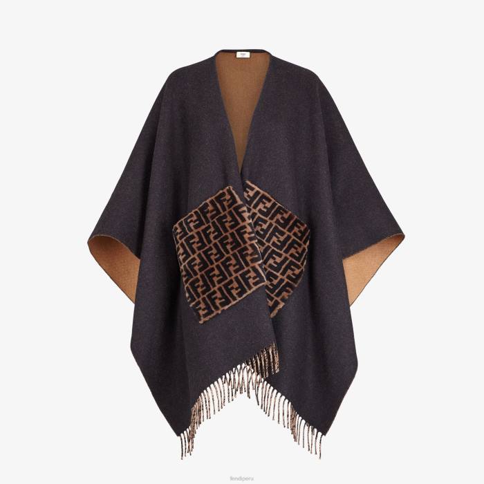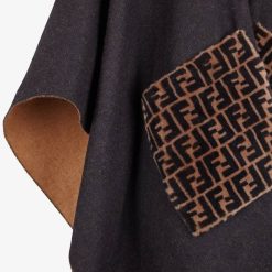 poncho rematado con flecos. Confeccionado en cachemir y lana negros. Maxibolsillos de piel de oveja con motivo ff.