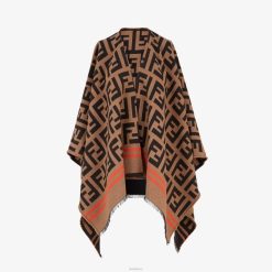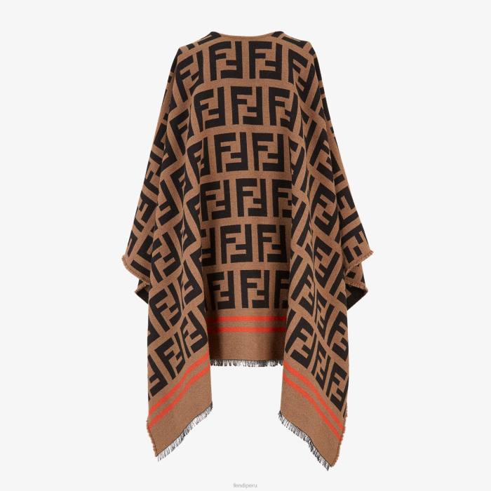 Poncho envolvente de gran tamaño confeccionado en jacquard de lana y seda tejido con estampado macro ff en tonos marrones y negros. acabado con una doble raya en color contrastante.