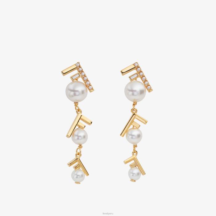 Pendientes colgantes con el primer logotipo de Fendi. fabricado en metal con acabado dorado. decorado con cristales talla baguette y perlas bijou blancas.