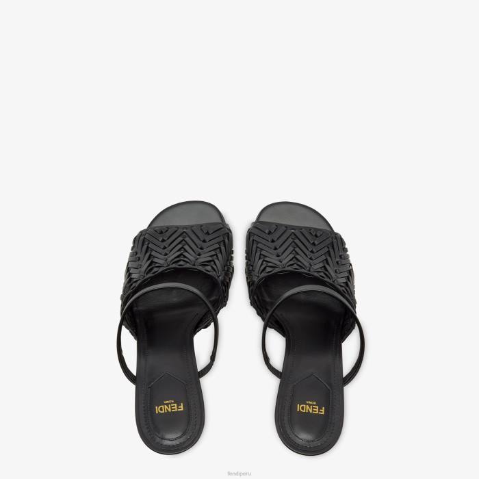 Primeras sandalias fendi con banda ancha y correa. Confeccionado en piel entrelazada de color negro. Tacón esculpido en forma de F diagonal de metal dorado.