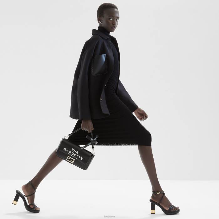 Sandalias baguette con bandas ligeramente acolchadas y tira cruzada en tobillo y arco. Confeccionado en piel napa negra. tacón con motivo baguette ff de metal dorado.