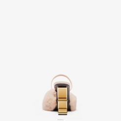 Primeras sandalias fendi con banda ancha y correa. confeccionado en visón rosa pálido. Detalles de piel tono sobre tono. Tacón esculpido en forma de F diagonal de metal dorado.