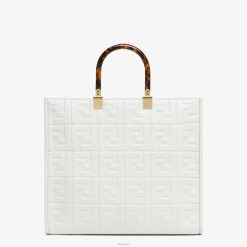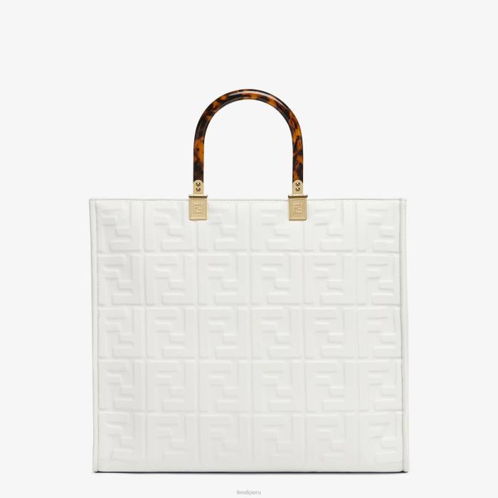 Bolso shopper mediano Sunshine confeccionado en piel blanca con motivo ff de textura 3D en relieve y asas rígidas de plexiglás efecto carey.