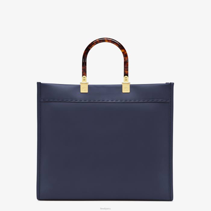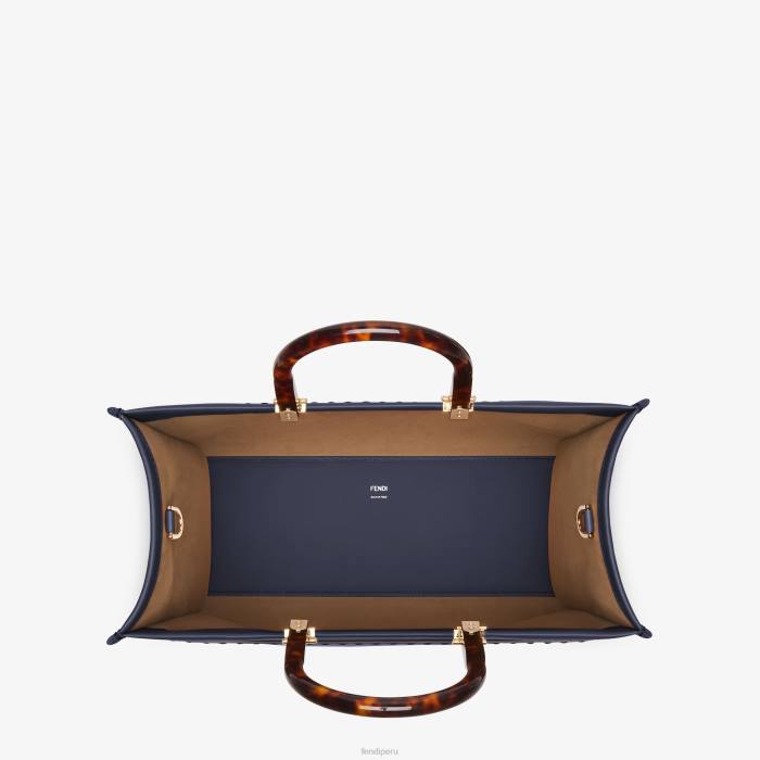 Bolso shopper mediano Sunshine confeccionado en cuero azul oscuro con letras fendi roma estampadas en caliente y asas rígidas de plexiglás en carey.