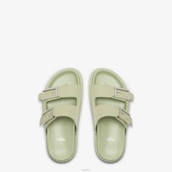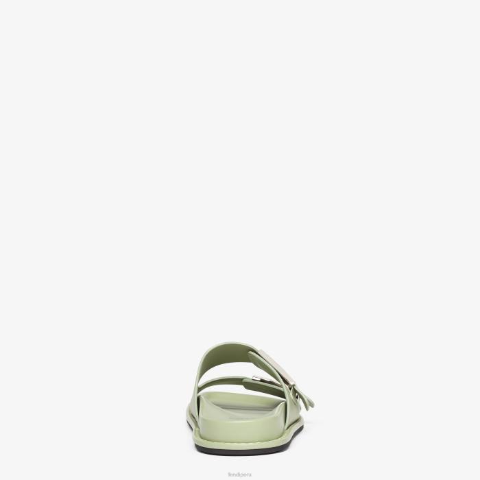 Chanclas planas de doble banda con hebillas decorativas ff baguette. fabricado en cuero verde. bordes adornados con grabados. Artículos metálicos con acabado en paladio.