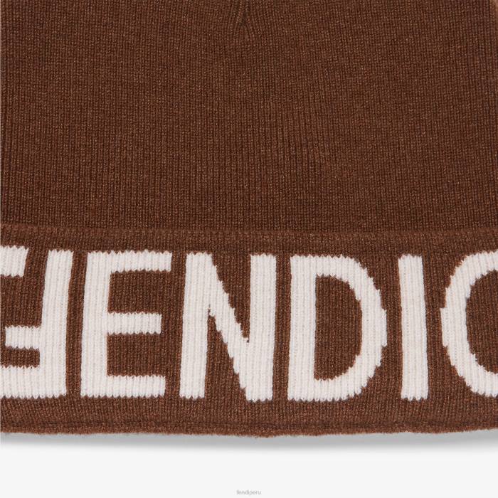 Gorro con vuelta. confeccionado en punto de lana marrón. el borde está decorado con un logotipo de espejo fendi en intarsia en un tono beige en contraste.