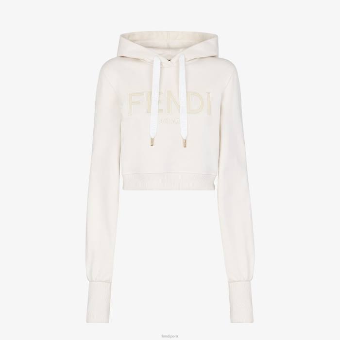 Sudadera corta con capucha con cordón. puños y dobladillo de canalé. confeccionado en jersey de algodón blanco. Letras de Fendi bordadas en la parte delantera adornadas con terciopelo del mismo color.