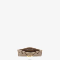 Es un tarjetero fendi con compartimento central y seis ranuras para tarjetas. acabado con el logotipo de Fendi Roma y una etiqueta interna. Confección en piel crucero beige. Nuevo logotipo de Fendi con acabado dorado.