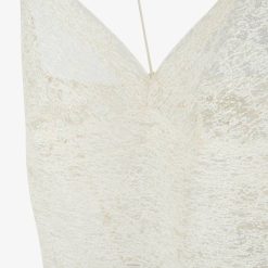 Top sin mangas con tirantes finos y escote en pico. hecho de encaje blanco. la silueta se acentúa con inserciones de tejido craquelado en los mismos colores.