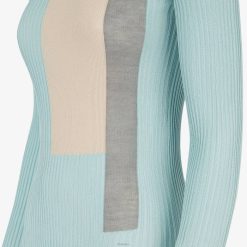 Camiseta de manga larga con cuello redondo. equipado. Confeccionado en punto de seda y viscosa azul claro que presenta una combinación de canalé e inserciones color block en la parte delantera en diferentes tonos con texturas en contraste.