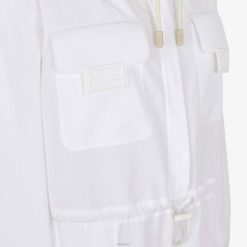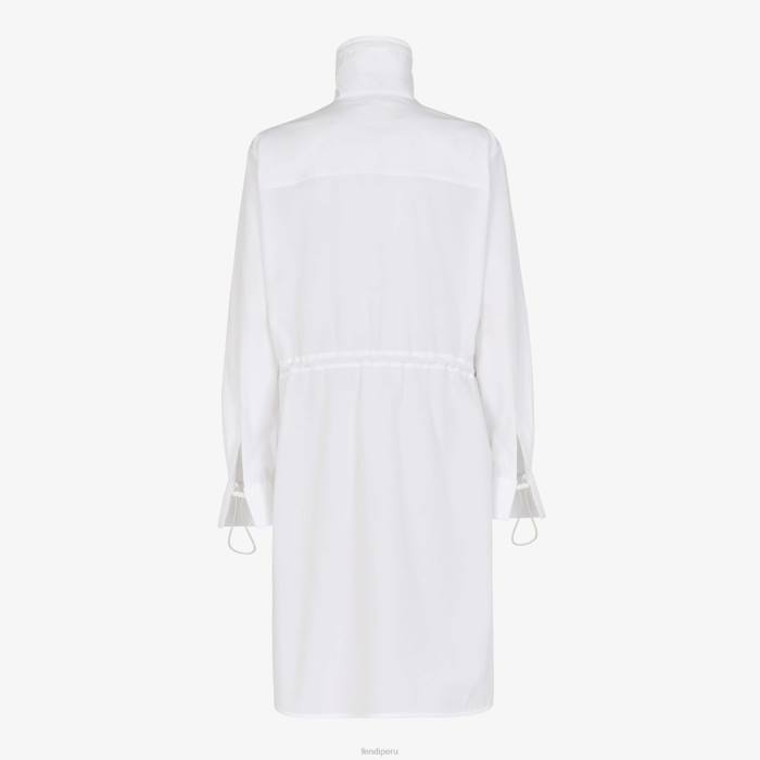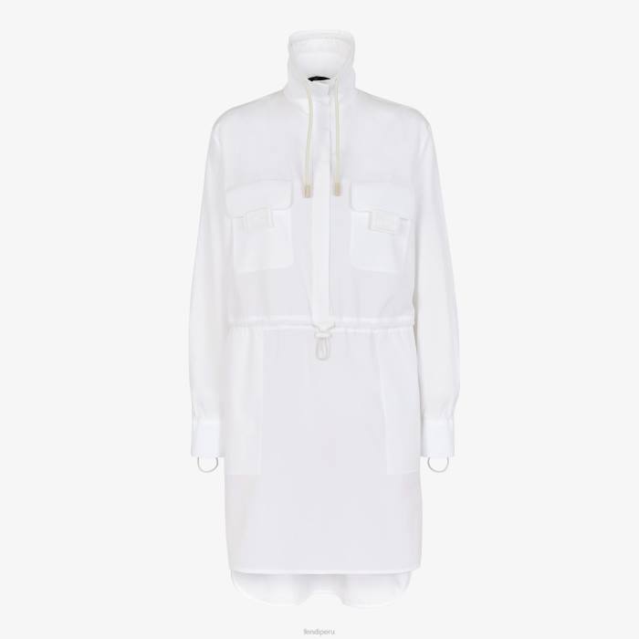 Vestido camisero de cuello alto, con cierre de media cremallera cubierta en la parte delantera. Detalle de cordón en cuello, puños y cintura. Línea recta con bolsillos laterales oversize, aberturas laterales y bajo asimétrico más largo en la espalda. Confeccionado en popelín de algodón blanco. dos bolsillos aplicados en el pecho con solapa y motivo ff baguette en relieve.