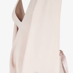 Vestido largo sin mangas con escote en pico y espalda descubierta. Línea fluida con cintura ajustada y corpiño suave y drapeado. la falda se cierra con cremallera trasera. Confección en cady de seda en tonos rosa pálido. los paneles laterales crean un suave drapeado en los hombros y sobre las caderas, para cerrar en la espalda con la cinta con el logo y anillos de metal.