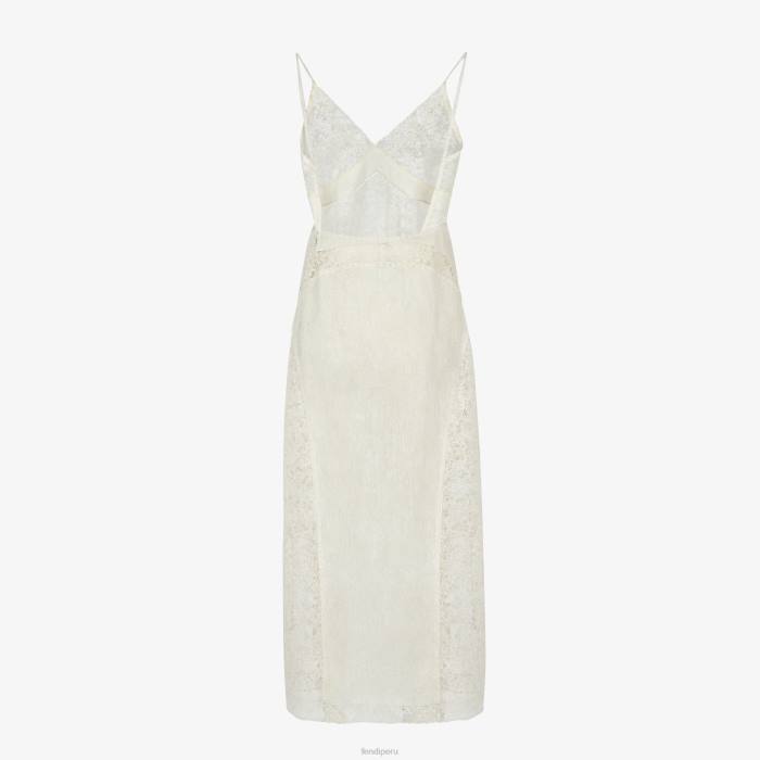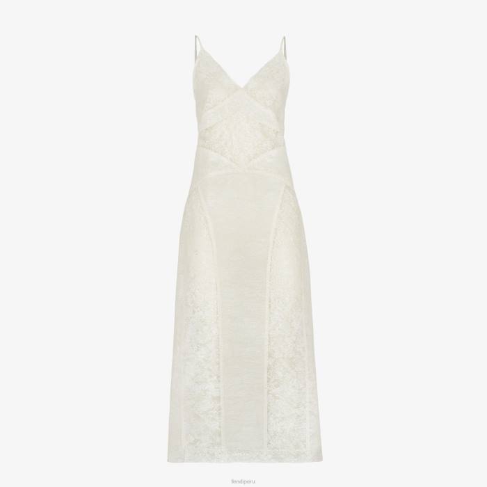 Vestido lencero fluido con cintura ajustada y falda ligeramente acampanada. tirantes finos y espalda descubierta. cierre de cremallera en el lateral. hecho de encaje blanco. la silueta se acentúa con inserciones de tejido craquelado en los mismos colores.