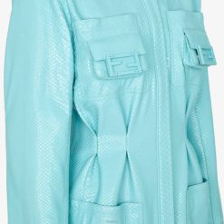 Vestido camisero con cuello redondo, pinzas en la cintura y manga larga con puño camisero. bolsillos con solapa y hebilla baguette ff en el pecho. fabricado en piel de pitón turquesa.