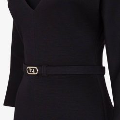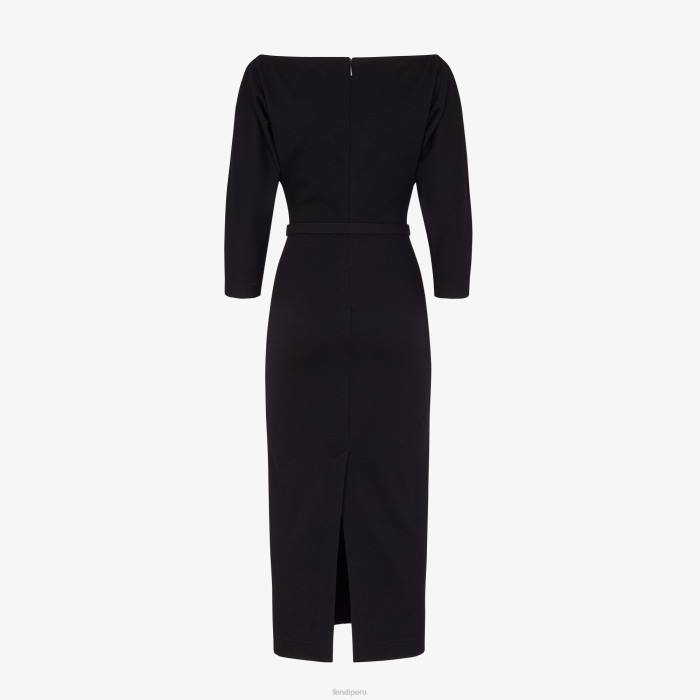 Vestido midi entallado con amplio escote en pico y manga tres cuartos. confeccionado con tejido de punto de lana negro. cinturón a juego con hebilla fendi o’lock de metal.